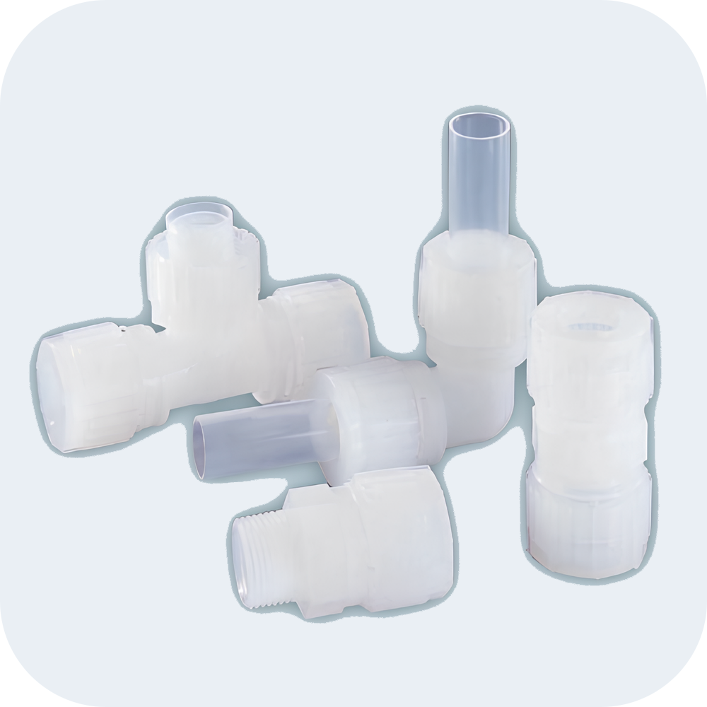 我們專注于高科技市場,特別是半導體、液晶和醫療領域。 主要提供耐化學腐蝕、耐熱和清潔的氟樹脂接頭、管件和泵。由于氟樹脂產品不受各種化學溶液的影響并且密封性強,被用于半導體晶圓清洗設備以及其他化學藥劑的運輸及循環設備。